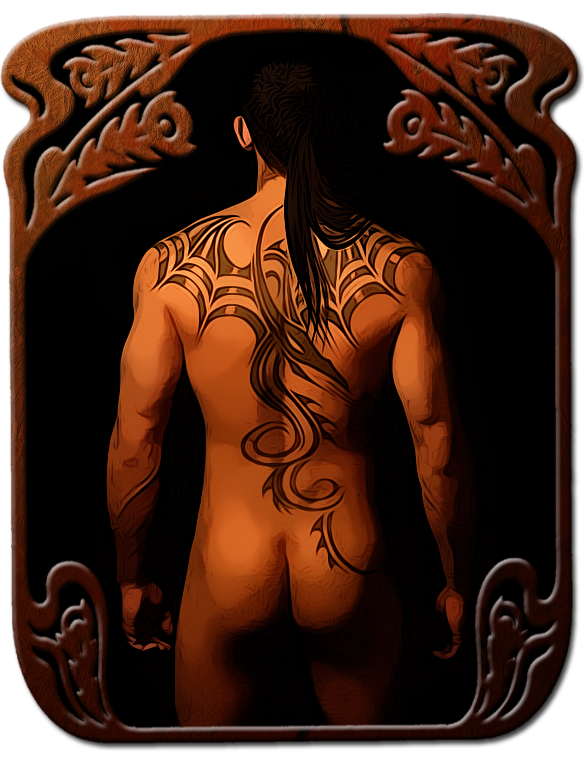 He locked eyes with her then peeled out of his shirt, exposing his flat stomach, muscular shoulders and the titanium rings that pierced both of his nipples. Swirls of brilliant color and splashes of stark black marked his skin from his throat down. Esoteric sigils and glyphs, mythical beasts, flowers and flames in every shade swirled and twisted around his muscular torso and banded his arms. He toed out of his boots, then his hands went to the button of his jeans.